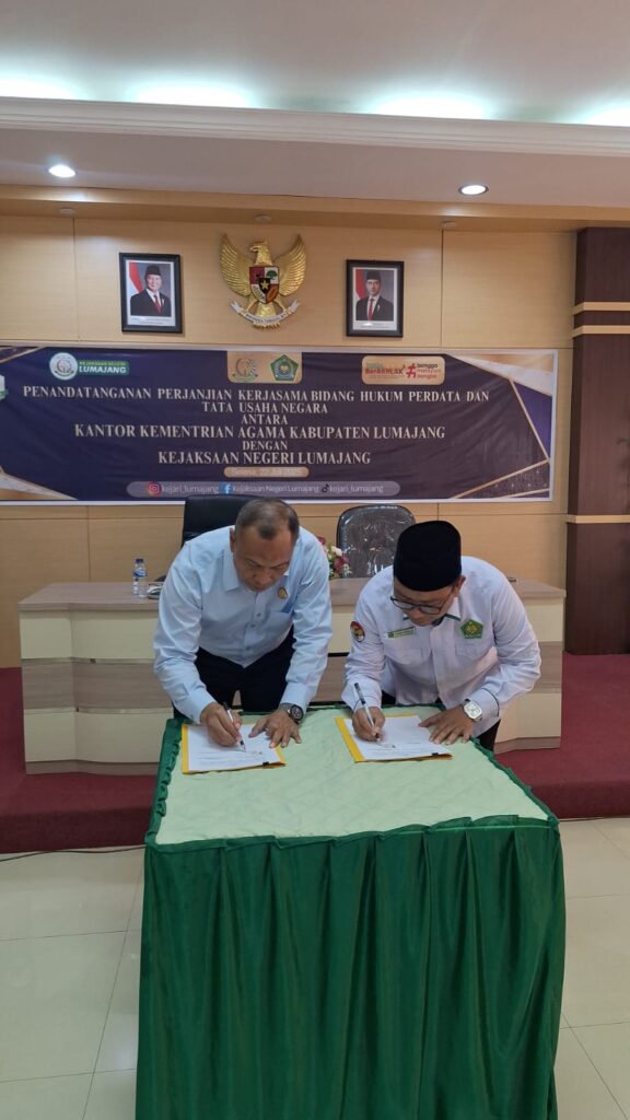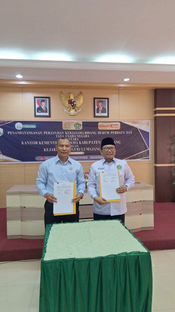 Lumajang (humas) Dalam rangka memperkuat tata kelola kelembagaan dan perlindungan hukum, Kantor Kementerian Agama (Kankemenag) Kabupaten Lumajang menjalin kerja sama dengan Kejaksaan Negeri (Kejari) Lumajang melalui penandatanganan perjanjian kerja sama (PKS) di bidang hukum perdata dan tata usaha negara. Kegiatan ini berlangsung pada Selasa, 22 Juli 2025 bertempat di Aula Kejaksaan Negeri Lumajang.
