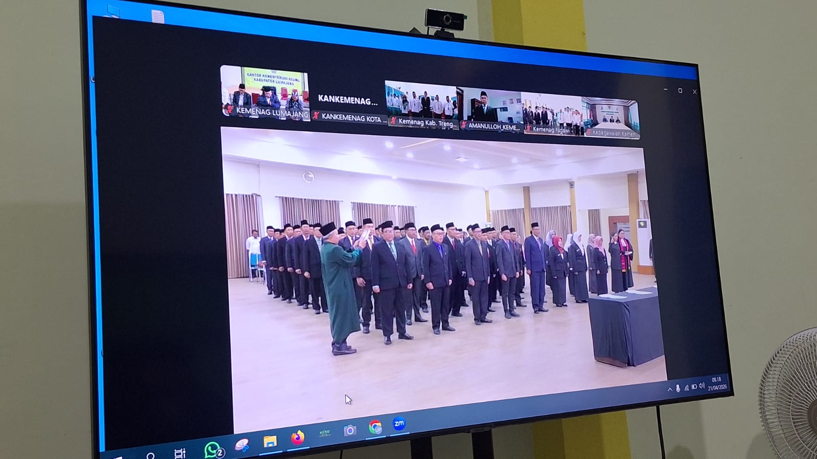 Lumajang (Humas) – Kepala Kantor Kementerian Agama (Kemenag) Kabupaten Lumajang bersama Kasubag TU dan Kasi Pendma mengikuti prosesi pelantikan dan pengambilan sumpah jabatan tiga kepala madrasah di lingkungan Kemenag Lumajang secara daring melalui *meeting room* Kantor Kemenag Lumajang, Selasa (21/4/2026).